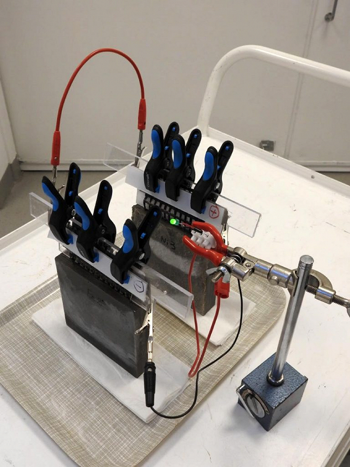 这个概念首先涉及水泥基混合物,添加少量短碳纤维以增加导电性和弯曲韧性。然后,在混合物中嵌入一层金属涂层的碳纤维网——铁作阳极,镍作阴极。经过多次试验,这就是研究人员现在展示的原型。