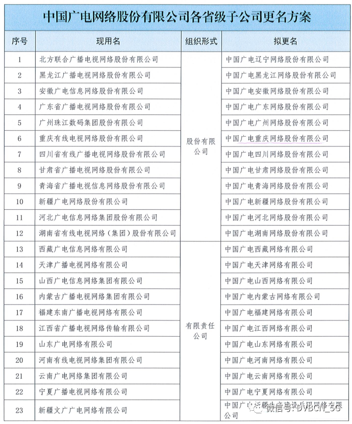 根据中国广电网络股份有限公司出具的《关于指导帮助中国广电网络股份有限公司各省子公司名称变更相关工作的函》,23家非上市系广电网络企业需要在5月31日前完成冠以“中国广电”的新公司名称,相应的负责有线电视业务的分子公司也会在6月底前完成更名工作。