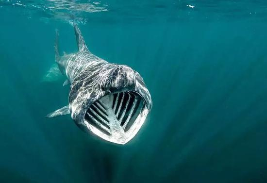 和鲸鲨一样,姥鲨是一种滤食性鱼类,以浮游生物为食,长有巨大的下颚。