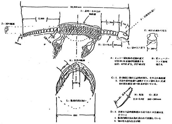 在丢弃前,矢野借来照相机拍下了我们现在能看到的5张珍贵照片,并且大概测量了一些数据,还在鳍处取下一块样本。