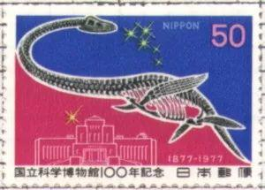 1977年,正值日本科学博物馆成立100周年纪念,当时发行的纪念邮票中有一张就是以蛇颈龙为主题的。