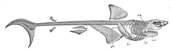 大白鲨的骨骼解剖图,注意胸鳍处骨骼