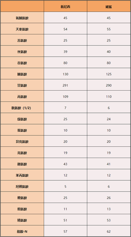 氨基酸分析的结果显示新尼西与姥鲨十分相似,差异指数(difference index)极低,仅有0.95。