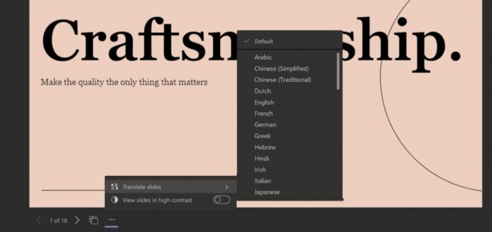 PowerPoint Live in Teams 目前还允许用户在一个统一视图中查看他们的幻灯片、笔记、图表和演示。这确保演示者和听众都专注于演示,演示者也不会错过任何紧急提示。在六月的更新中,Teams 演示窗口将增加对实时翻译的支持。这个新的幻灯片翻译功能将允许任何人(与会者、演示者)私下翻译演示内容。与会者可以右键点击演示文稿来访问翻译功能,如下面的截图所示。