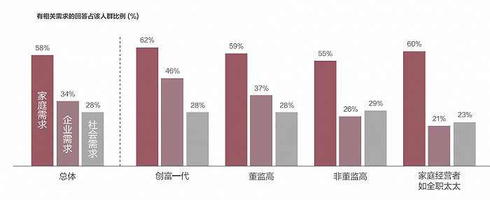 具体来看,在企业需求方面,传统经济创富一代的财富来源更加集中于企业经营收入,他们对企业融资/贷款方案等企业融资需求较高。在家庭需求方面,家庭子女教育及代际传承安排需求的迫切性和重要性凸显。