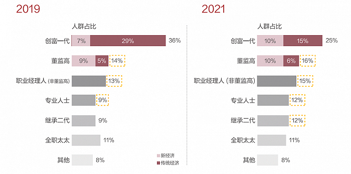 2021年随着互联网、新能源等新经济、新行业的迅猛发展,股权增值效应助推新富人群崛起。报告显示,创富一代企业家占比缩减至25%,董监高、职业经理人(非董监高)、专业人士群体规模首次超越创富一代企业家群体,占比升至43%。