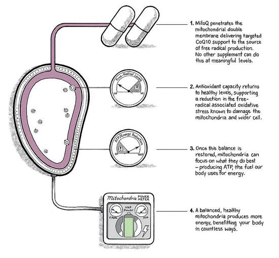 大概在上世纪90年代,剑桥大学专家迈克尔墨菲与生物化学家罗宾史密斯专门进行了以线粒体为课题的研究,试图解决抗氧化剂无法进入线粒体内部去中和自由基的问题。随着生物技术的不断进步,并经过多年的潜心研究,科学家们终于找到了一种相应的线粒体靶向抗氧化剂-Mitoquinol mesylate,简称MitoQ,或MitoQ®分子,并在细胞研究中发现MitoQ®分子能够有效保护细胞免受过氧化氢诱导的细胞凋亡。这也为膳食补充剂打开了一扇窗。