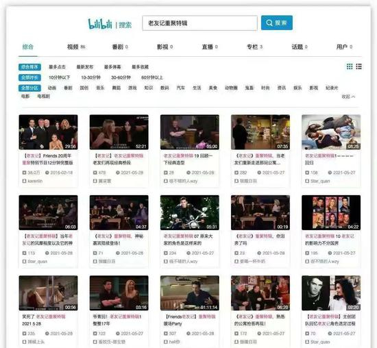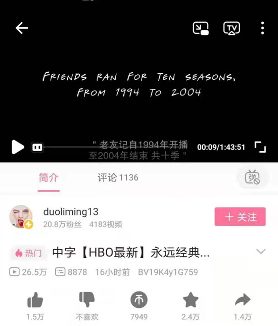 以一个叫“duoliming13”的UP主为例,他在B站坐拥20万粉丝,内容多是搬运欧美明星的MV视频或综艺卡段,每条视频日常播放量为几千到几万不等,然而《老友记重聚特辑》全片发出后,16小时就为他带来了26.5万的播放量。