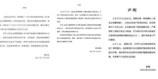 然而在上线次日,爱奇艺、优酷、腾讯视频同时发表声明称,在《老友记重聚特辑》上线后几小时内,B站就出现了大量侵权盗版视频,包括完整正片、卡段以及带有画面的二次加工内容。