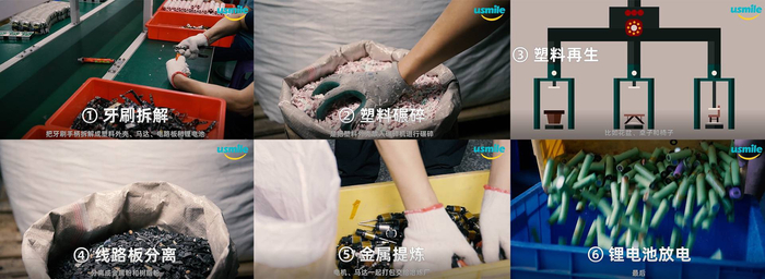 回收旧的电动牙刷后,usmile将它们打包送往具有国家环保局认证的回收公司,牙刷被拆解为塑料外壳、马达、电路板和锂电池,塑料被进行再生成为工业级塑料循环使用,金属电子原件则通过碾碎、冶炼成为各种有价的金属材料,锂电池放电后被冶炼成金属循环利用。