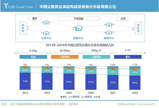 公路货运在中国的物流运输结构中占绝对的主导地位,公路货运量占全社会货运量比例长期在75%以上。公路货运市场业态又呈现快递、零担、整车物流三分天下的格局,其中零担与整车物流占比公路货运市场近9成。