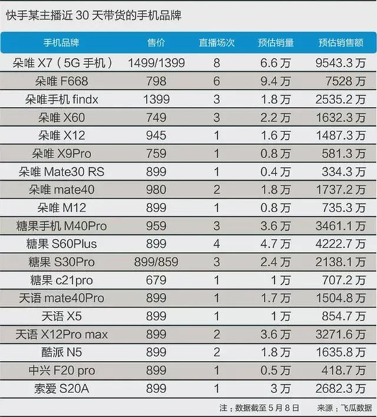 有媒体通过飞瓜数据平台统计显示,在驴嫂过去30天带货手机里,朵唯手机出现9次,排名第一的朵唯X7卖了大约9543万元。但驴嫂售卖的排名靠前的朵唯手机型号,在朵唯天猫旗舰店根本找不到,而能找到的机型大多只卖了100台,快手上则动辄上万台。