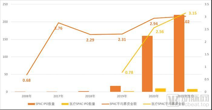 由于资本市场利率持续走低,体量越来越大的货币匹配不到足够的优质资产,需要探索新的工具,便推动了SPAC IPO数量和融资额不断创新高。其中,服务医疗健康领域的专业SPAC出现稍晚,但发展发展迅猛。