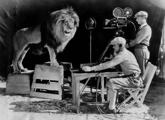 而之前网上流传过一个图,配的解说是“原来米高梅电影片头的狮子是这样拍出来的”——