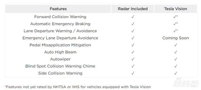 马斯克宣布智能驾驶系统开启纯视觉化转型后,放弃了毫米波雷达的新款 Model 3 和 Model Y 成为了被怀疑、甚至口诛笔伐的对象。有人指出,放弃毫米波雷达对降低系统成本的作用微乎其微,反而大概率会让自动紧急制动、车道偏离预警 / 避让这样至关重要的主动安全性功能失效。