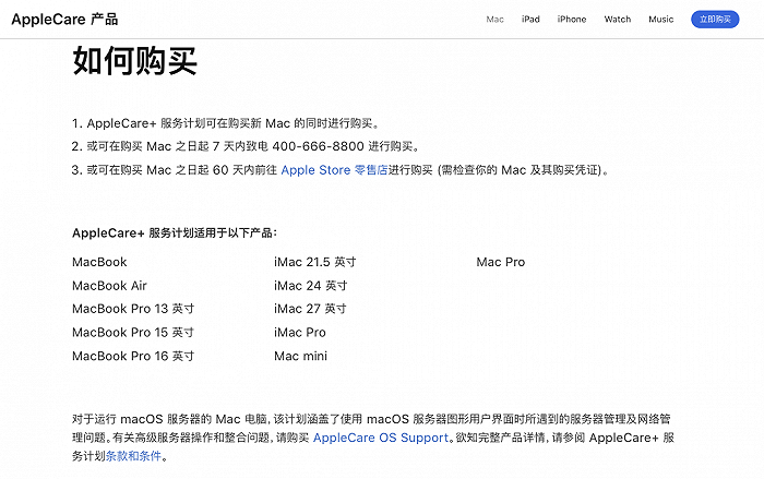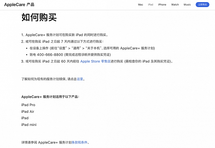 苹果中国官网调整AppleCare+购买期限,从60天缩短为7天