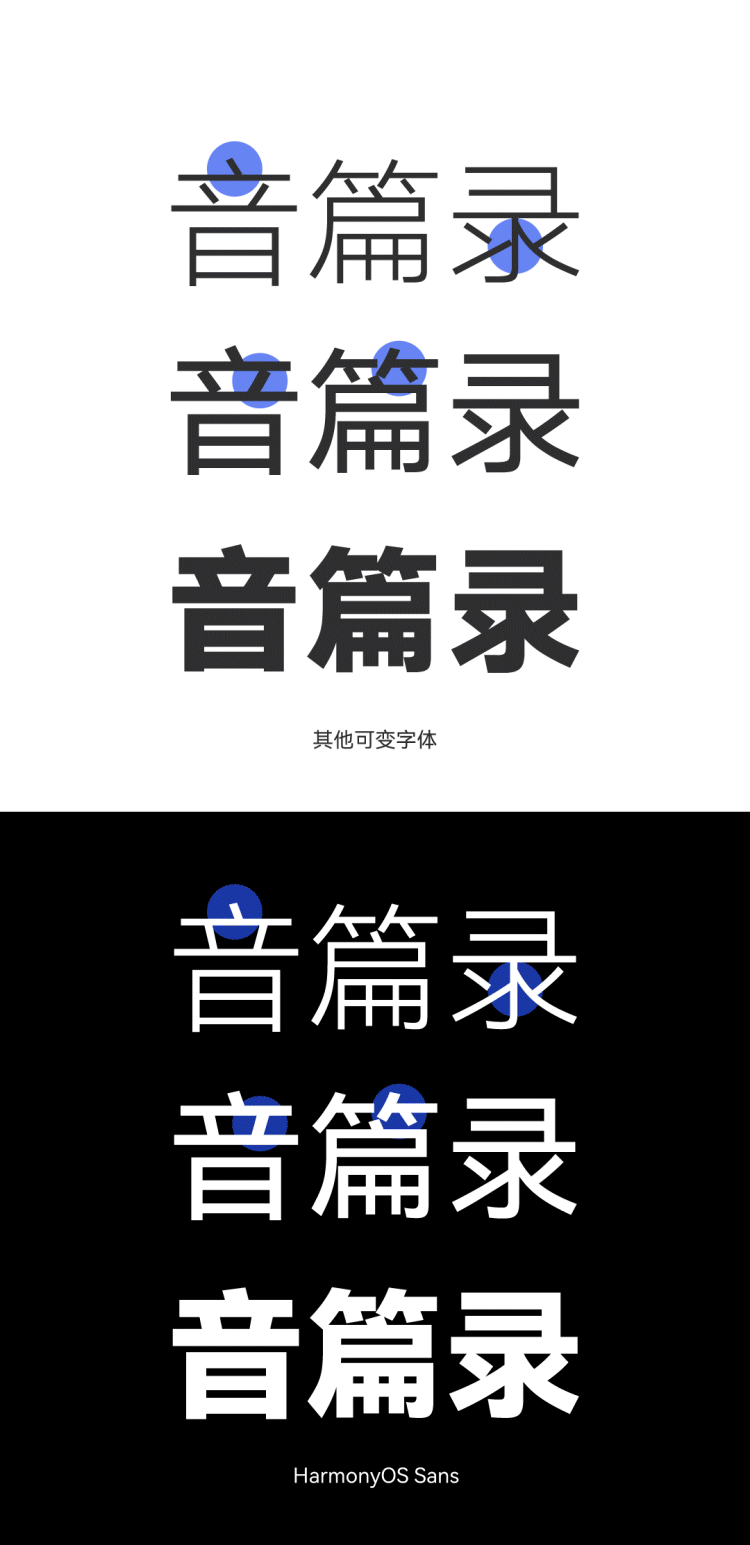 中文笔画复杂,HarmonyOS Sans 在设计时为应对可变字体笔画连接处易破碎的情况,做出优化统一处理,使得字体最终呈现效果干净而利落。