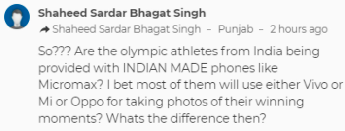 还有网友讽刺说:“所以???印度奥林匹克运动员们有被提供印度国产Micromax手机吗?我敢打赌,他们大部分人将用VIVO、小米或者OPPO来为他们的胜利时刻拍照。所以区别在哪?”