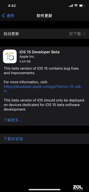 iOS 14.6版本苹果iPhone 12 Pro升级至iOS 15开发者版本前需要下载一份5.54GB大小的更新包。安装好描述文件,在软件与更新中即可搜索到“iOS 15 Developer Beta”更新,下载并安装即可。