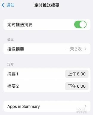 同时,用户还可以在设置中对摘要推送的频率、时间、涉及到的App进行自定义。