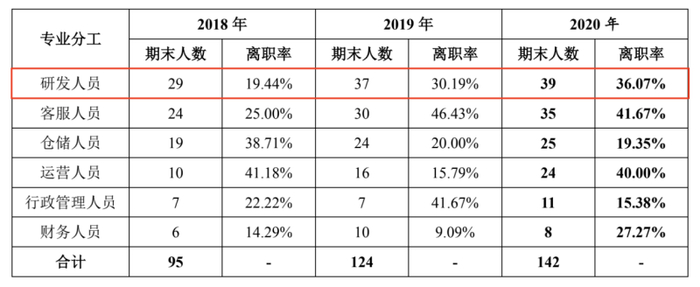 此外,趣睡科技的离职率也非常高,2019年、2020年公司研发人员离职率分别高达30.19%、36.07%,简单来说每年三分之一的研发人员都要进行重新洗牌,不稳定的团队也会对研发产品产出有所影响。而不仅仅是研发团队,客服人员、运营人员离职率甚至超过40%。