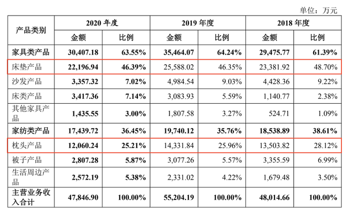 2018年、2019年和2020年趣睡科技分别实现营业收入4.8亿、5.52亿和4.79亿,其中床垫产品和枕头产品合计就为公司贡献了7成以上收入,2020年二者收入占比分别达到46.39%和25.21%。