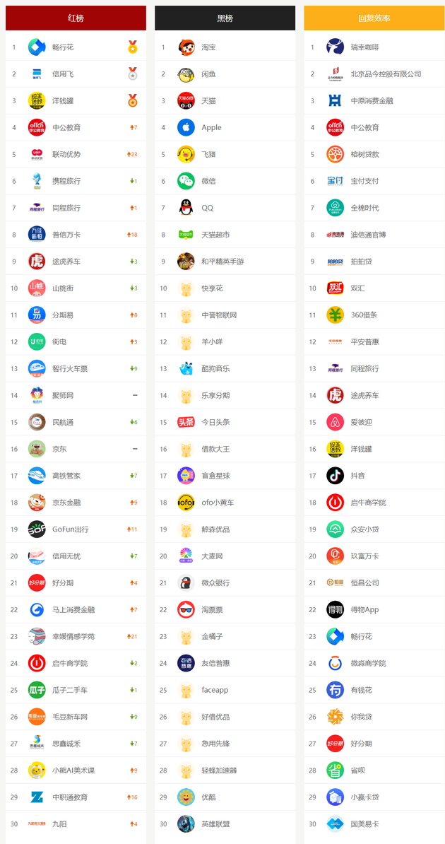 红榜:畅行花、信用飞、洋钱罐、联动优势、普信万卡、山桃街、分期易、京东金融、信用无忧、好分期
