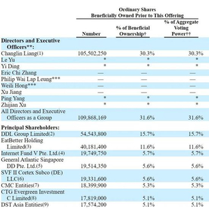 招股书显示,IPO前,老虎环球通过Internet Fund V Pte. Ltd.持有叮咚买菜5.7%的股份,为第一大外部股东,美国泛大西洋投资集团持股5.6%。软银愿景基金以5.6%的持股成为第三大机构股东,CMC资本、今日资本、DST亚洲分别持股5.3%、5.1%、 5.1%,这些投资者上市后的账面收益都将超过3亿美元。