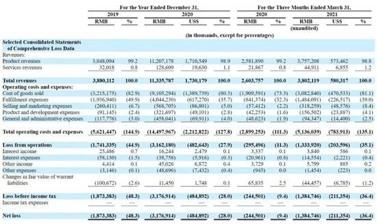 招股书数据显示,叮咚买菜2019年的营收是38.8亿元,2020年增长到113.358亿元,但同时净亏损从2019年的18.7亿元扩大至2020年的31.7亿元。虽然2020年亏损率(28%)较2019年下降了近20个百分点,但在2021年一季度,叮咚买菜亏损率反弹至36.4%,比去年Q1增加了整整27个百分点。
