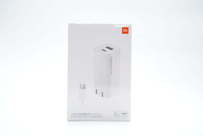 包装盒包裹一层防热缩塑封膜,正面印有MI logo、充电器套装图、产品名称、65W以及USB-C接口标识。