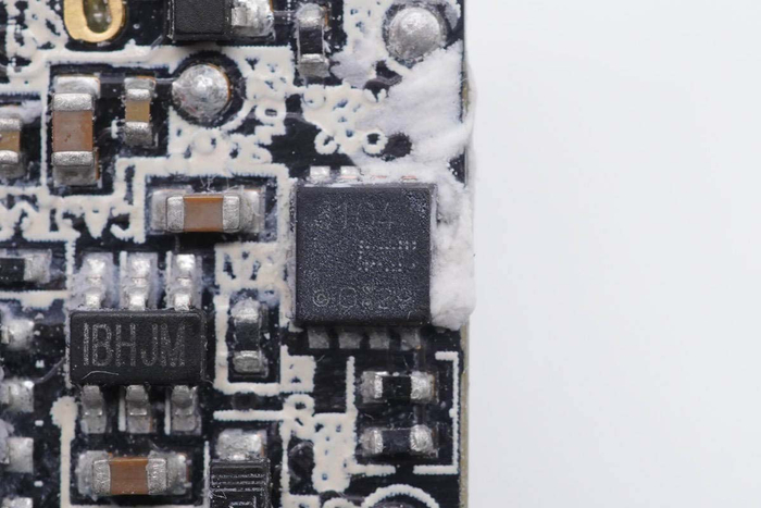 PCB板背面一览,变压器对应区域镂空,以降低厚度。主板背面可以看到开关电源主控芯片、反馈光耦、贴片Y电容、氮化镓功率芯片以及用于A口输出的同步升降压转换器等器件。