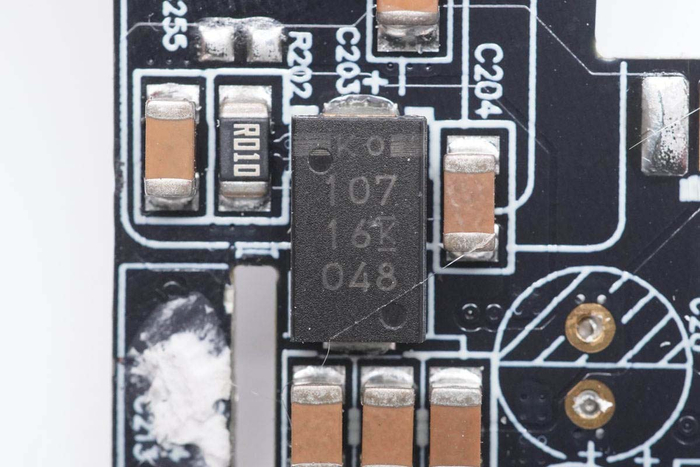 将小板拆下,输出端可以看到同步整流控制器以及整流管,还有一颗VBUS开关管。USB-C母座沉板焊接。