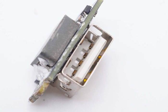 侧面一览,大小两颗电解电容均包裹绝缘胶带。USB-A接口小板上的合金电感打胶加固。
