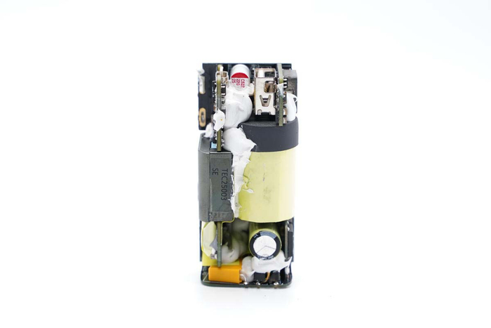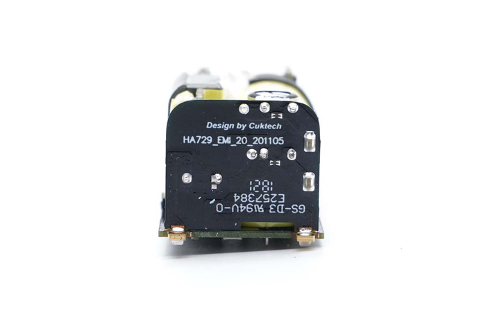 拆掉塑料壳,输入端垂直焊接两块小板,小板上是交流输入滤波和整流电路。小米65W氮化镓充电器通过多块小板焊接元件,提高充电器内部的空间利用率,从而实现高密度的充电器设计。