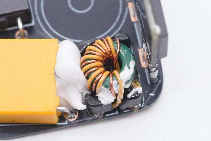 磁芯与变压器电路板之间塞有一块蓝色导热垫,将线圈发热传导至磁芯加强散热。