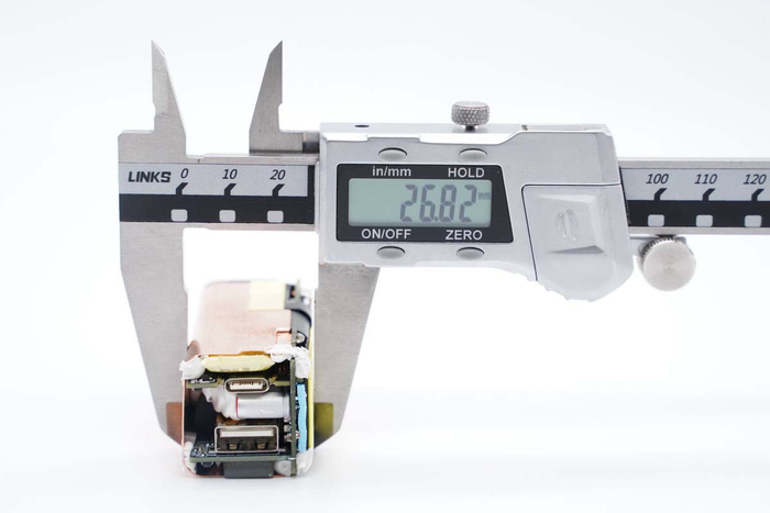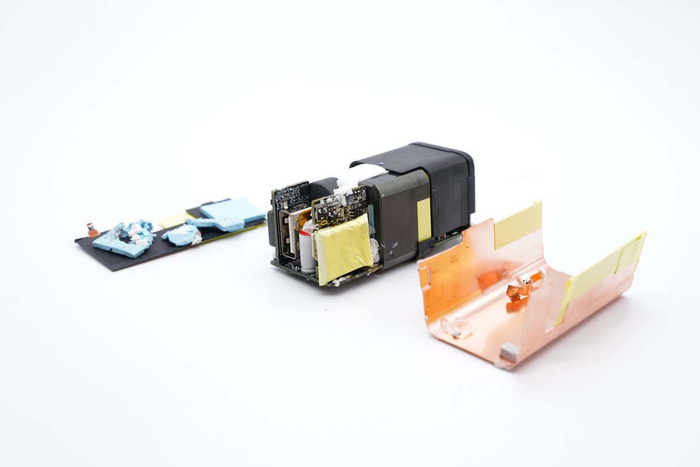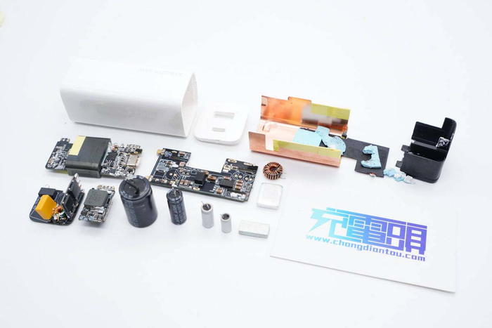 充电头网拆解了解到,充电器内部设有多块PCB板,平面变压器小板横贯初次级,两端贴有铝散热片帮助导热,整个模块还覆盖纯铜散热片进行整体散热。输入端套有塑料壳绝缘加固,两块小板和主板相互垂直焊接,结构稳定,USB-C母座沉板以及使用金属片点焊加固,USB-A母座粘贴防尘胶带。整体设计做工可圈可点。