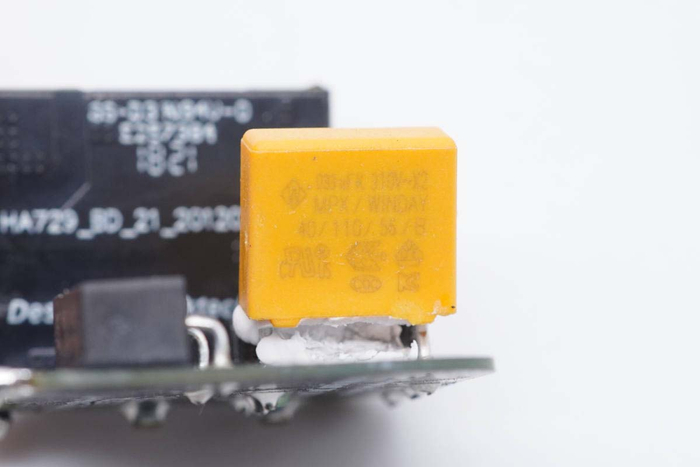将电容、小板等全部拆掉,主板正面中间贴有一块黑色小胶垫用于支撑高压滤波电解电容,旁边两颗贴片Y电容串联,此外还有一颗钽电容。