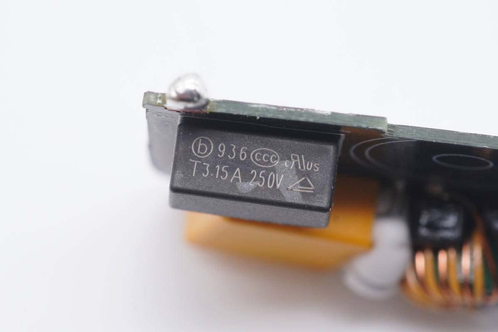 将两块小板拆下,其中一块上有保险丝、安规X电容以及共模电感。小板上圆形空位是主板上的滤波电感位置。