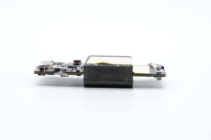平面变压器另一面粘贴绝缘胶带,输出端有一颗协议芯片。通过将同步整流电路和协议芯片都整合在平面变压器的电路板上,可减小走线长度,降低辐射干扰,并提高空间利用率。