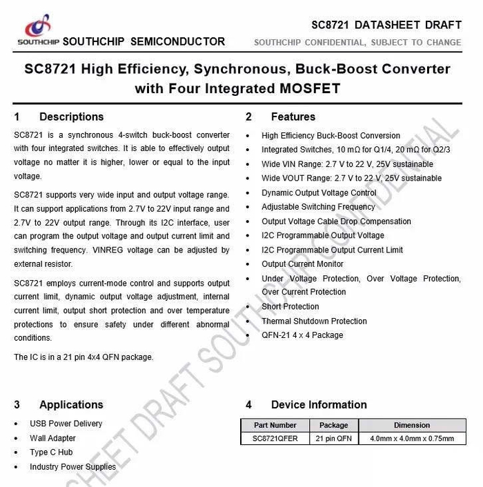 南芯SC8721详细资料。充电头网了解到,采用该芯片的产品还有ANKER 25600mAh移动电源、努比亚红魔45W USB PD氘锋移动电源、小米20000mAh移动电源、thinkplus 14000mAh 45W PD快充移动电源等。
