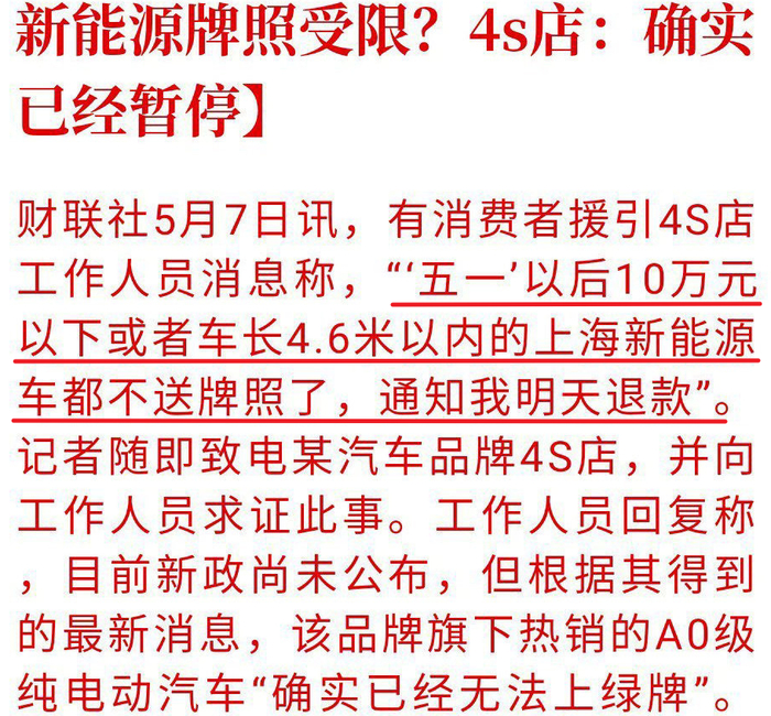 但就在前段时间,上海却公布了一个新政策,车长 4.6 米以内的新能源车不给牌照了……