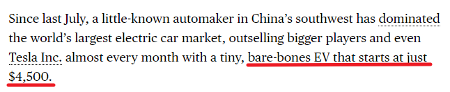 比如报道的第一段就说五菱宏光的电动车销量领跑全球,而且价格仅售4500 美元。