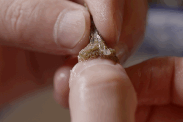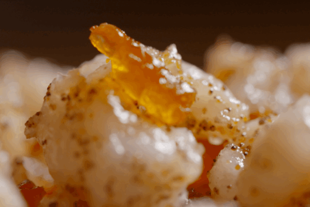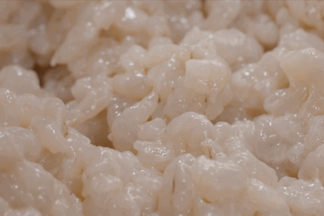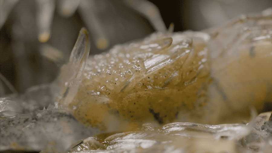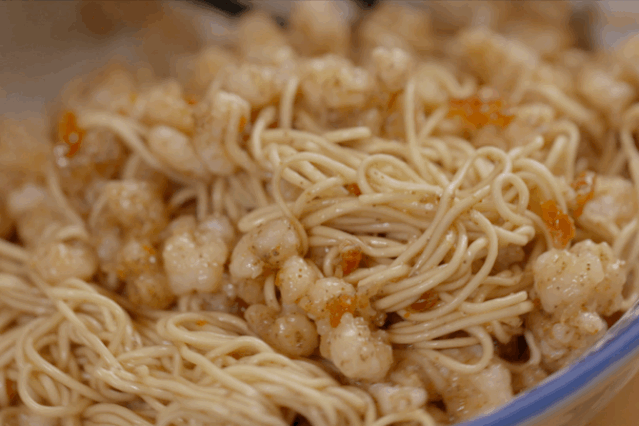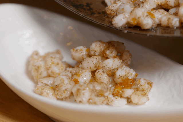 然后加上葱、姜等材料调味,不停翻炒将近一个半小时,直至虾籽由转黄,炒成焦黄色,即可出锅。20斤河虾取籽炒制,最终成品也不过170克。