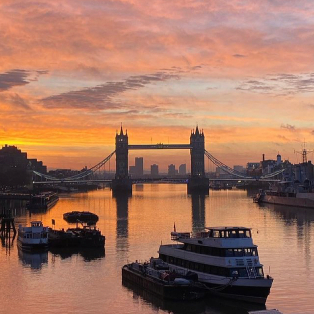 在英国最具标志性的建筑之一伦敦塔桥上观看日出,能在英国首都的大部分地区醒来之前,见证伦敦的面貌。泰晤士河的两侧,鳞次栉比的现代化建筑与古老房屋并置排列着,河上是终日繁忙的码头船坞。夏季凌晨4点多,清晨的阳光在东伦敦上空划过,橙色和黄色的鲜艳色调反射在周围的玻璃建筑中,远处的摩天大楼点映在天际线上,千禧桥连通着河的两岸,圣保罗大教堂的穹顶展现出美丽的弧度,泰特美术馆的烟囱直插云霄,这是繁忙的大都市难得一见的宁静时刻。