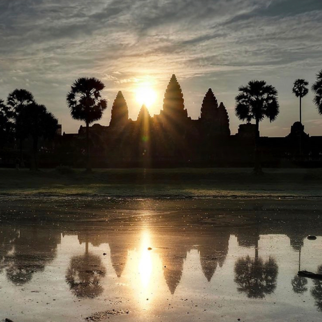 作为世界上最大庙宇类建筑,吴哥窟是柬埔寨暹粒郊外庞大的寺庙建筑群的一部分,其历史可以追溯到12世纪。它最初是一座印度教寺庙,后来逐渐转变为一座佛教寺庙,融合了各种风格建筑的影响。寺庙前的荷花池畔是观看日出的最佳地点,每天清晨,都有来自全世界的旅行者来此静候,只为定格下上帝最美的杰作。当第一丝光划破黑暗,5座尖塔在微亮的天际线形成明显的黑色剪影。每年的春分日前后,是这里最美的日出,太阳将从小吴哥剪影正中间升起。