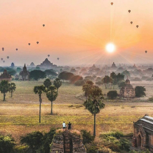 蒲甘是位于缅甸中部老城,拥有 2000 多座古老的寺庙,有“万塔之城”的美誉。这些佛塔佛寺建筑是各个时期建造并保留下来的,是缅甸古建筑艺术的缩影。清晨登高望远,无数寺庙的形状在日光下形成剪影,与初升的太阳交相辉映,浓郁的色彩宛若一幅油画作品,使人感到超凡脱俗的平静。通常在每年10 月至次年 4 月期间,游客可以在蒲甘乘坐热气球观景,空中欣赏从这片古老土地上冉冉升起的太阳,感受这座经历过风沙侵蚀、世人遗忘、战争掠夺的城市的积淀和沧桑。