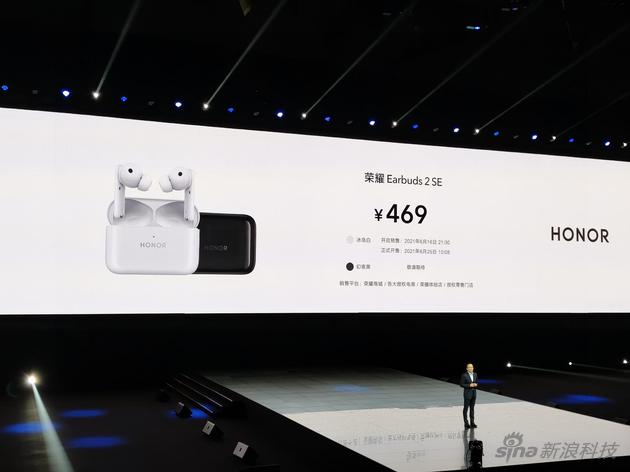 此外,还有一款荣耀Earbuds 2 SE无线耳机,支持主动降噪,续航长达32小时,还支持快充技术,“充电10分钟,听歌4小时”。这款耳机配合荣耀50系列使用,开盖即连,非常方便。该耳机售价469元。