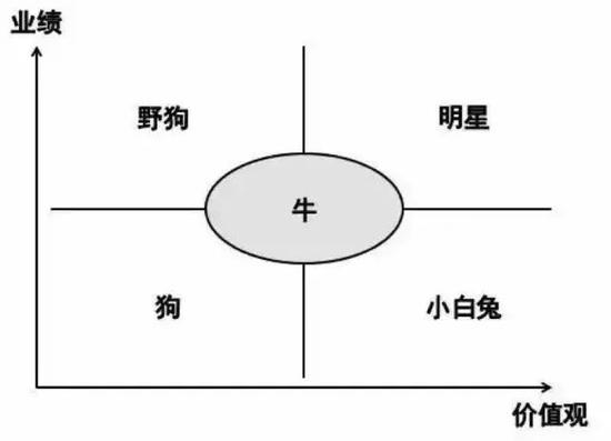 4)、老板最头疼的是小白兔,兢兢业业,勤勤恳恳,就是没有业绩,看起来无害,但他的危害比野狗还要大。为什么?第一,他是小白兔,他招来的人就更怂,团队的素质会越来越低;第二,他是短板,你要花很多的时间补他的短板,而这些时间你本应该花在明星身上。