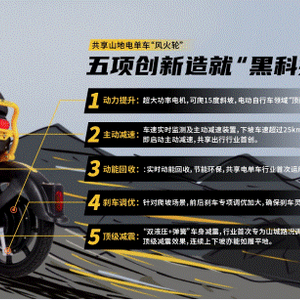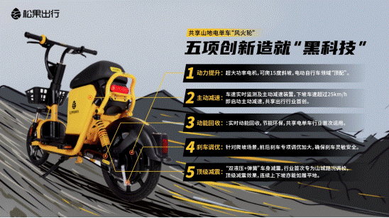 松果出行此次推出的共享山地电单车“风火轮”,与常规共享电单车相比,在动力、安全、骑行体验三个方面拥有五项行业首创的技术创新,从而造就了这一“黑科技”产品。