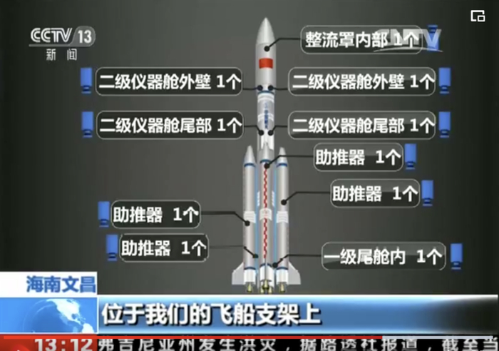 4 个助推器的发动机尾舱各装一个,一级尾舱 2 个,二级仪器舱外壁 3 个,二级尾舱 2 个。